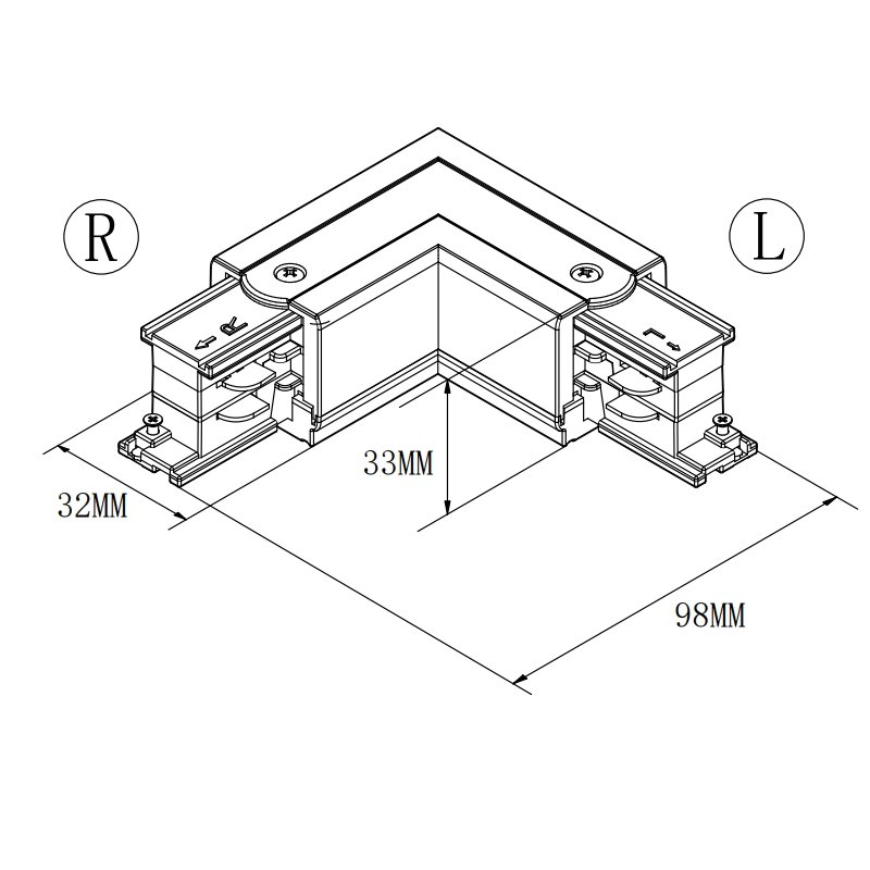 Mantra Eco trifazni L-priključak (unutrašnji) u crnoj boji za šine. Bez sijalice, IP20 zaštita. Za L-spoj sa unutrašnjim napajanjem.